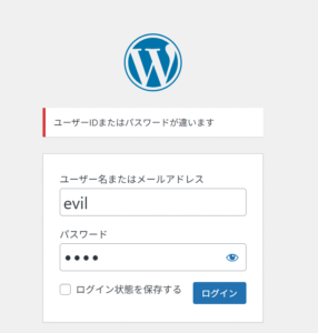 evilという架空のユーザーIDとパスワードでログインを試行します。通常であれば不明なユーザー名ですとか、パスワードが違うというヒントを提示してしまいますが、このプラグインではそんなメッセージは出しません。すべて統一します。これは、パスワードのリマインダー画面でも同様のエラーが発生するようになっています。理由は先に挙げた通り(あなたが攻撃者に親切な人でなければ)、ヒントを与えること自体が攻撃の危険性を増すためです。また、間違えれば間違えるだけ、内部でデータベースのカウント回数があがっていくため、ロックアウトへのタイムリミットが始まります。今回のしきい値は5回なので、このまま5回間違えてみます。