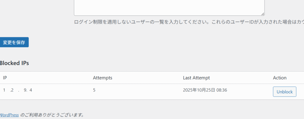 通常のブルートフォースアタック対策プラグインと違い、本気でブロックするタイプのプラグインです。そのため、極力管理者ユーザー、ホワイトリスト対象ユーザーはホワイトリストに入れることを推奨します。一応、最大制限時間数は24時間に設定していますが、固定IP環境など、プロバイダーから割り当てられたIPアドレスが変わらない環境下で、自分自身が間違えすぎると自分が締め出されてしまいます。このプラグインには緊急リセット機能などは設けていません。また、REST APIなど代替経路もブロックするため、締め出しを喰らうと自身でSQLの値を弄る以外に解除の方法がありません。設定の際には十分注意が必要です。そのため、推奨するのは特権ユーザーのみログイン制限を適用せず、低権限ユーザーはすべて規制対象とするものです。もちろん、わざと間違えまくれば自分のログインができなくなって詰みますが…