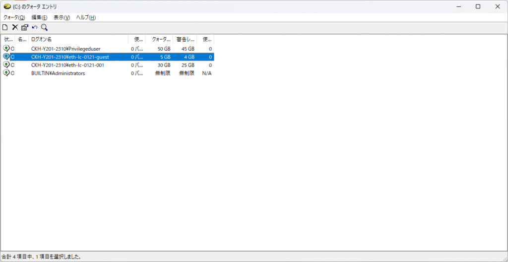 別に一般ユーザーなのにディスククオータを設定する意味は私もよくわかりません。意味がわからないですが、無制限にディスクを書き込めてしまうのは個人的に好きではありません。リソースは当然限られていますので、一般ユーザーでさえ最大30GB、管理者ですら50GBまでに制限します。特に制限の厳しいゲストユーザー君はほぼ何もできないレベルに抑えました。ここで注意してほしいのは、「明示したユーザー以外にディスクの制限をかけると文鎮化する」ことです。Windowsには様々なユーザーがバックグラウンドにいますが、間違えて一律5GBとかにすると立ち上がらなくなって再インストールすらできなくなります。クオータの管理を有効にするにチェックをつけて、ディスクの仕様を制限しないはそのままにしてください。クオータエントリーから制限したいユーザーを追加していくだけで充分です。