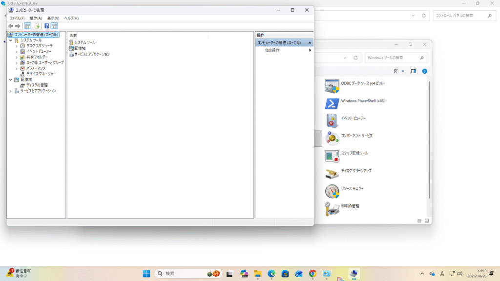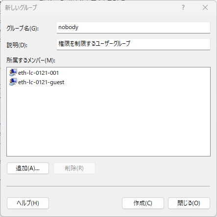 「コントロールパネル」から右上の検索「コンピューターの管理」でコンピューター管理画面を開いたら、「ローカルユーザーとグループ」→「グループ」を選択してグループを作成します。名前はなんでも良いと思いますが私は「nobody」にしました。このように管理者権限のいらないユーザーたちを突っ込みます。