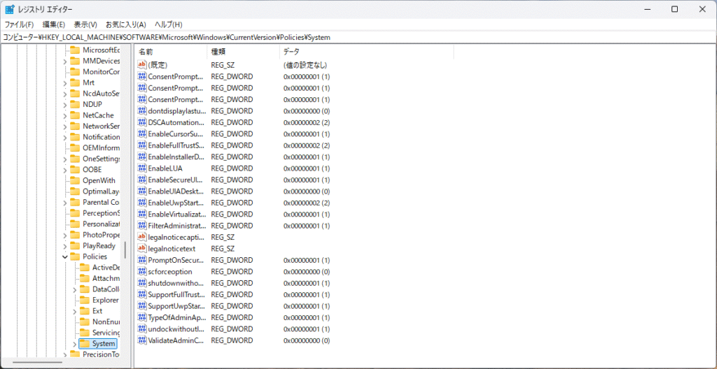 この状態で権限を制限するユーザーグループを作成しました。これはのちに、AppLockerを設定する際にまとめて権限制限が可能というメリットがあります。続けてユーザーアカウント制御の厳格化にも手を出します。ファイル名を指定して実行で、regeditと入力するとレジストリエディタが開きますので、[HKEY_LOCAL_MACHINE\SOFTWARE\Microsoft\Windows\CurrentVersion\Policies\System]」へアクセスし、次の値を有効にしてください。