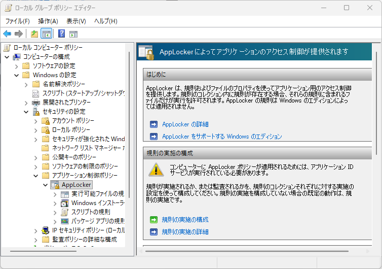 まだこれでも満足できません。AppLockerを設定します。ファイル名を指定して実行で、「gpedit」と入力して実行します(管理者権限必須)。「Windowsの設定」->「セキュリティの設定」->「アプリケーション制御ポリシー」と辿り、グループポリシーの設定を入力していきます。